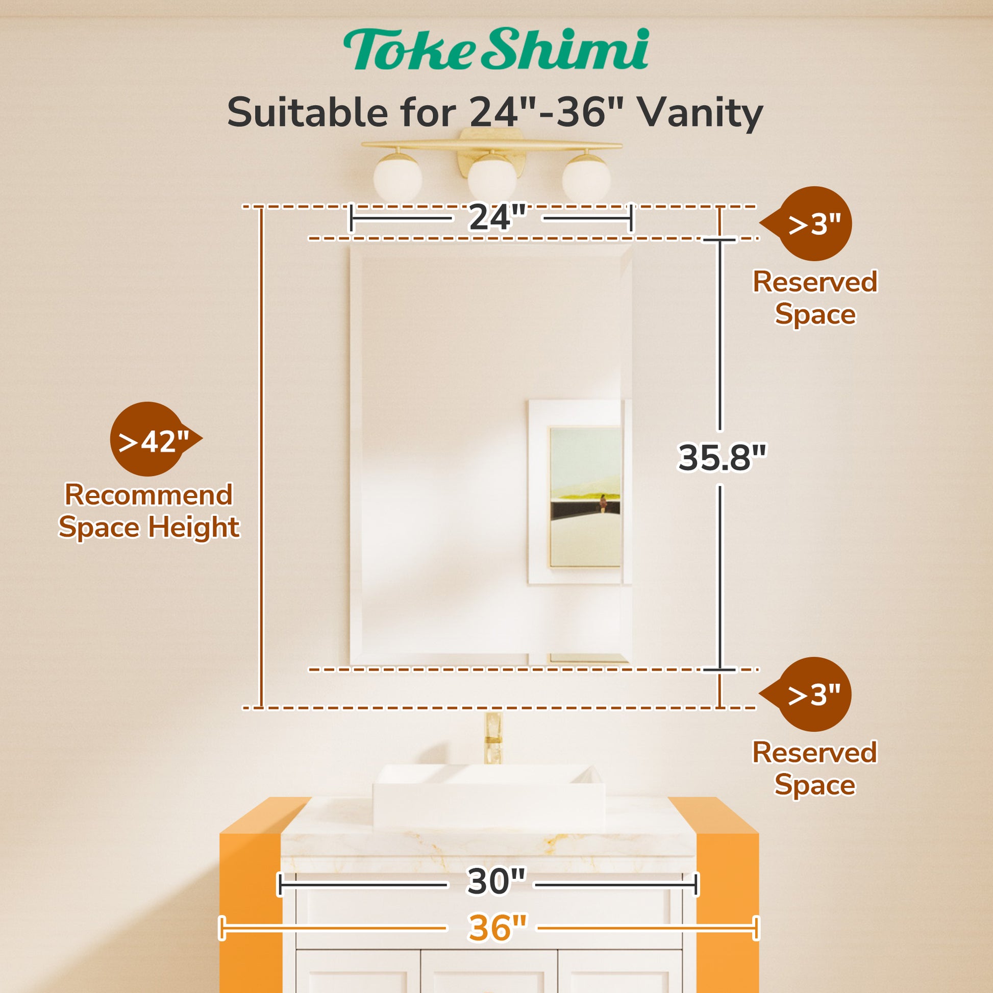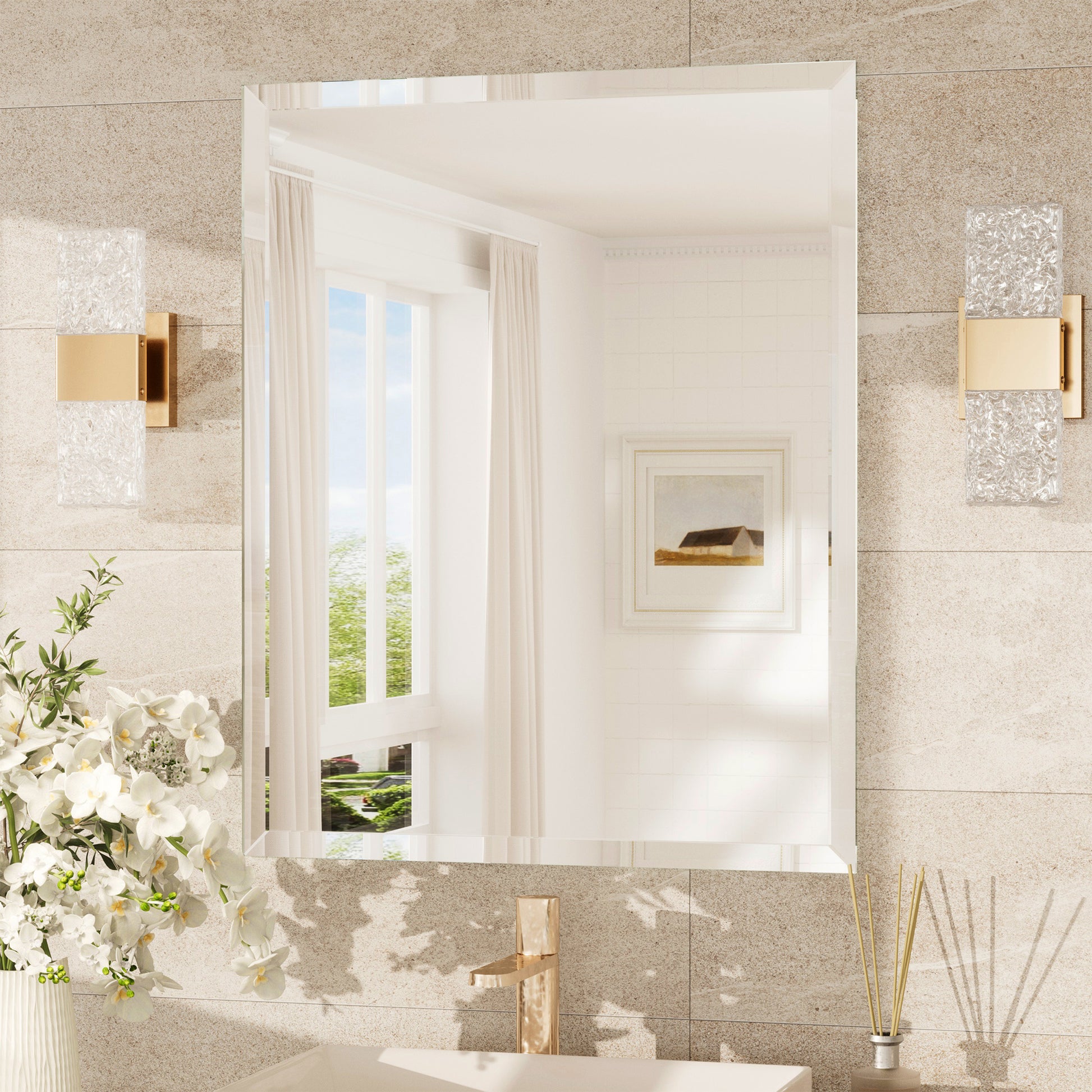 1. Sleek Beveled Design: Step up your style with our sleek frameless bathroom mirror featuring a beveled edge that adds a touch of fashion-forward flair. Simple yet stunning, this 40 x 30 decorative wall mirror fits perfectly in any space—whether it's your bathroom, hallway, bedroom, or entryway.Also, this bathroom wall mounted mirror's frameless style integrates effortlessly into any bathroom decor, from farmhouse, modern to industrial.