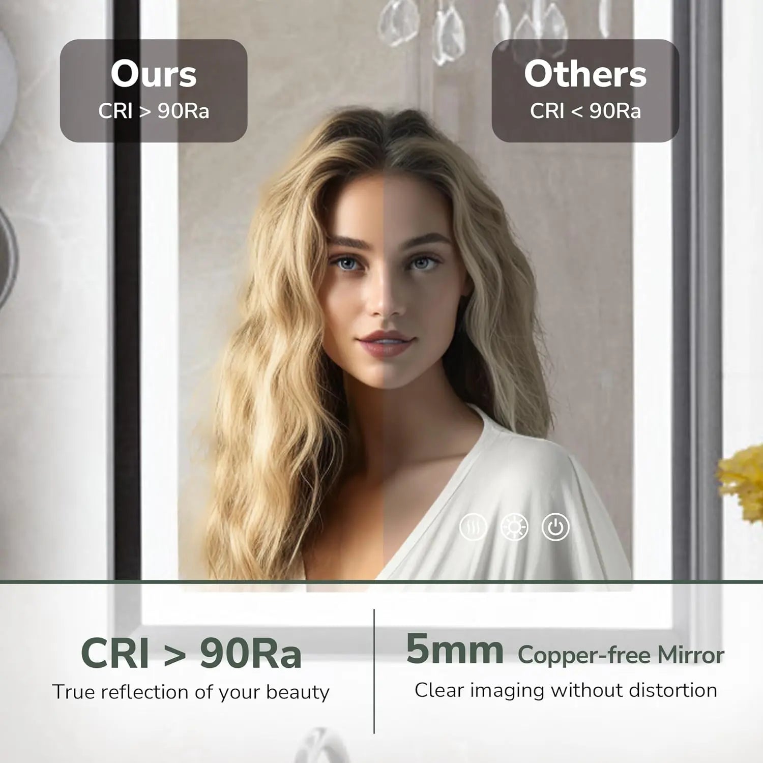 3. Tricolors, Stepless Dimmable, Anti-Fog, Memory: The Lighted bathroom mirror is  controlled by 2 touch buttons, one for color temperature (3000K, 4000K, 6000K) and brightness level (10%~100%).Smart memory function stores the preferred lighting settings and anti-fog button provides a 5-minute heating and 1-hour auto cut-off function for safety and energy efficiency.