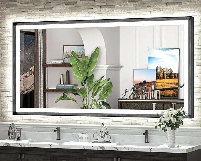 LED Bathroom Vanity Mirror with Frame – Backlit and Front Lighted, Aluminum Rectangle with Beveled Edge, Tricolor Stepless Dimmable, Anti-Fog, Memory Function, Modern Wall Decor