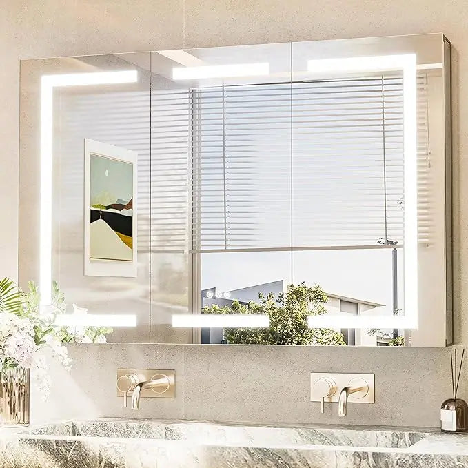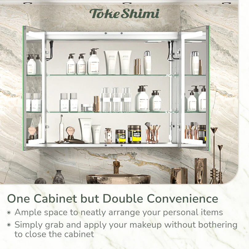 1. Enhanced Brightness and Balance:  TokeShimi Double-Sided LED Mirrored Medicine Cabinet offers an upgraded version of brightness and balance to ensure a superior lighting experience. Equipped with high-performance two-in-one LED strips and a wider diffuser, the cabinet provides more even and enhanced light, illuminating both the exterior and interior with twice the brilliance.