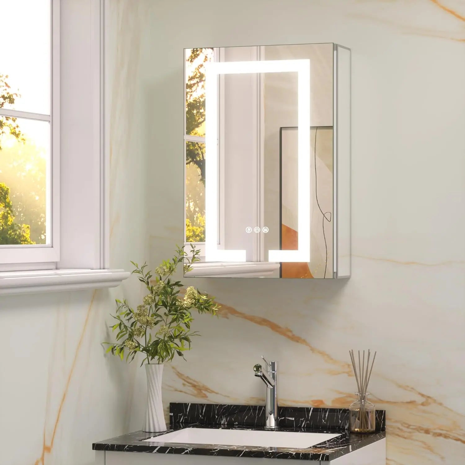 2. Double Convenience by the Double Mirrors: The double-sides mirrors allow you to effortlessly grab and apply your makeup without closing the cabinet. Besides, mirror on each side shares the same light settings. By simply pressing the buttons on the front mirror, you can select the ideal color temperature and brightness for both mirrors. In addition, the recessed medicine cabinet with lights will remember your last settings, ensuring a seamless restart every time.